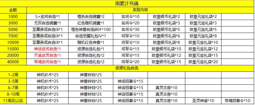 2.奖励需玩家联系客服申请,本周申请上周奖励并进行发放,充值时间统计周期为【上周一0点至上周日24点】申请角色一周内的累积充值