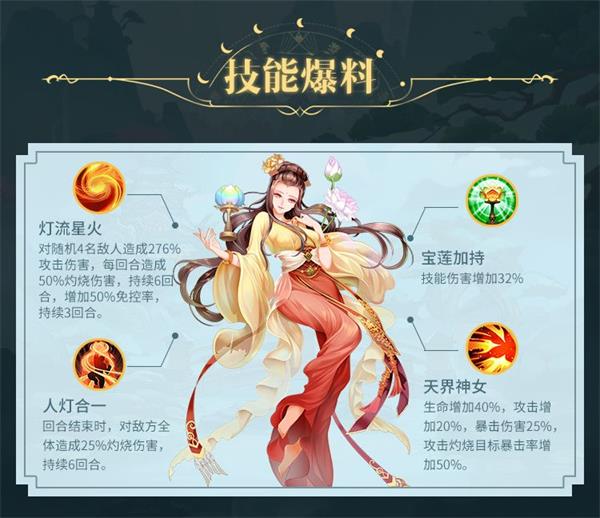 三圣母的定位是法术输出,能提供持续灼烧伤害和高额暴击伤害。它的专属武器“宝莲灯”,乃混沌生成之灵物,灯内之火,能毁万物,这让三圣母拥有在团队中稳站输出C位的能力。