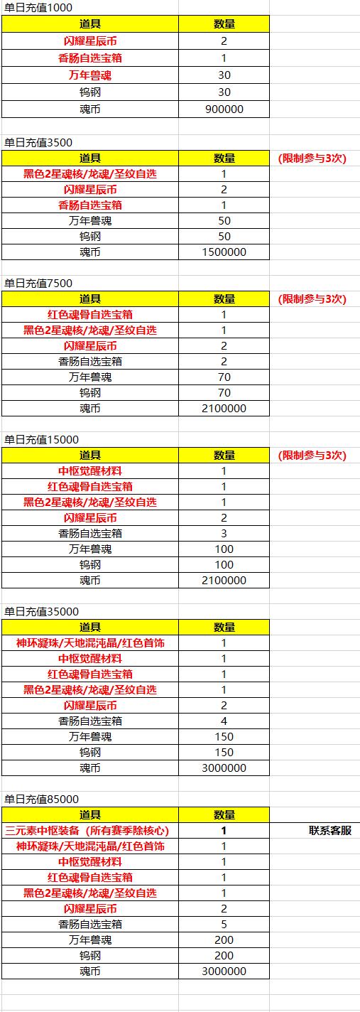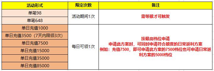二、单日充值返利:(兼容常驻返利,按最高档位领取,比如:单日充2K,领取日常返利2K档+限时1K档,仅限于限时活动开启期间