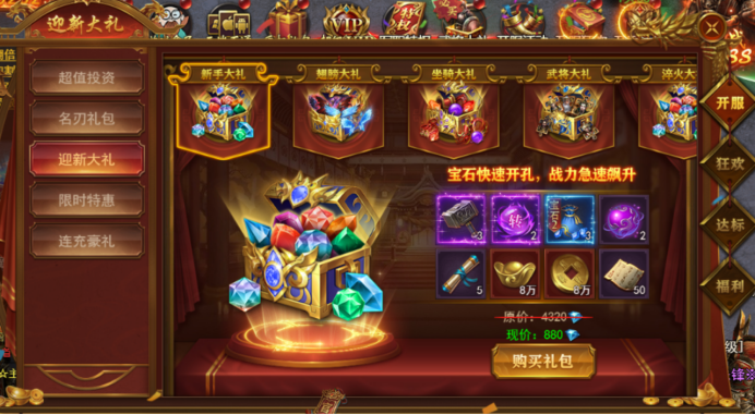 众多礼包助力提升,新手大礼、翅膀大礼、坐骑大礼、武将大礼、淬火大礼、宝石大礼等。