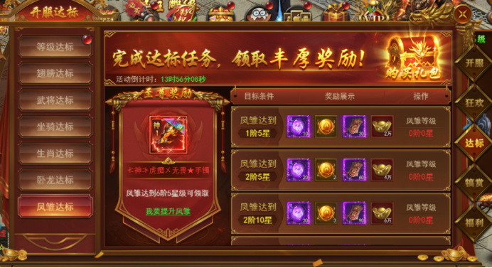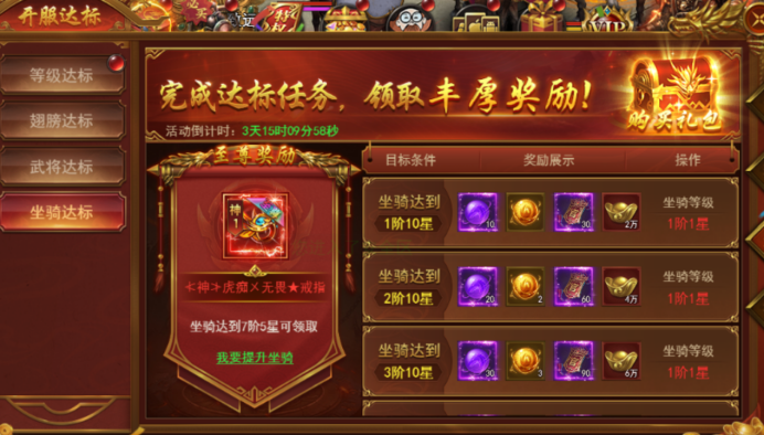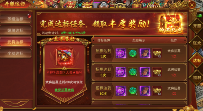 新服前6天每天开启不同的达标活动,活动持续6天,完成达标即可领取丰厚奖励。