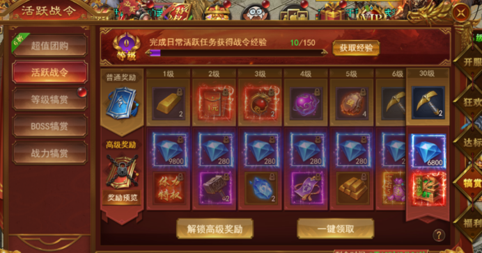 打包享受折扣购买,立即激活活跃战令、等级犒赏、BOSS犒赏、战力犒赏。