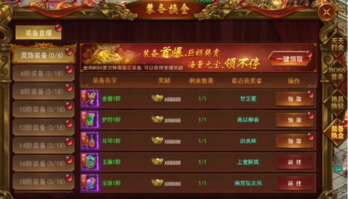 击杀BOSS首次掉落特定装备,可以获得首爆奖励