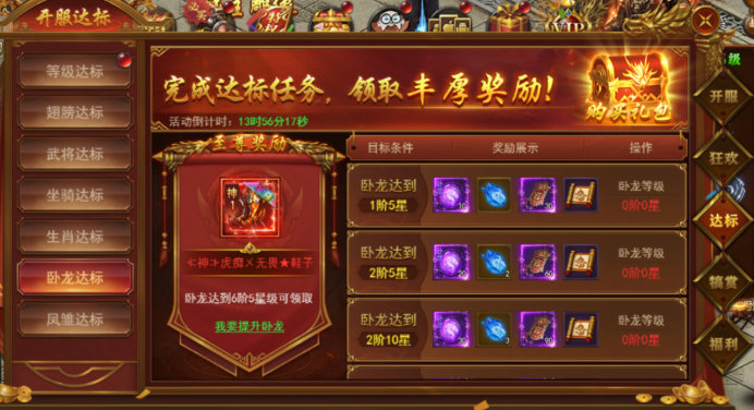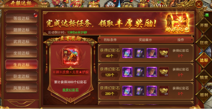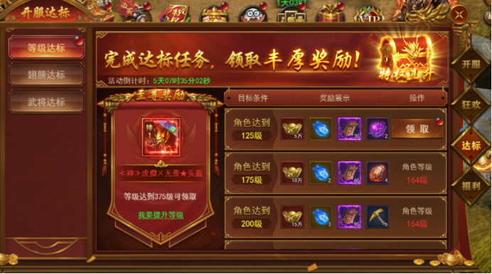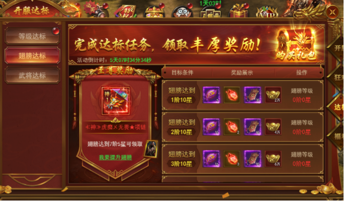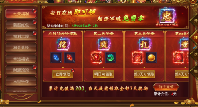 新服前6天每天开启不同的达标活动,活动持续6天,完成达标即可领取丰厚奖励。