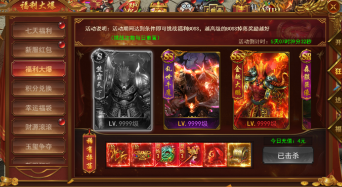 活动期间完成条件即可挑战福利BOSS,越高级BOSS掉落奖励越好