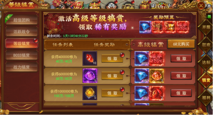 打包享受折扣购买,立即激活活跃战令、等级犒赏、BOSS犒赏、战力犒赏。