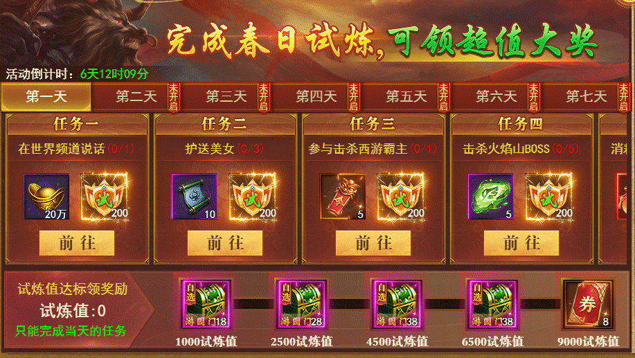 任务阶段达标每日目标升级宝盒,奖励阶段每日领取宝盒奖励,最高可免费升至5级宝盒,直购6级宝盒可领时装大礼!