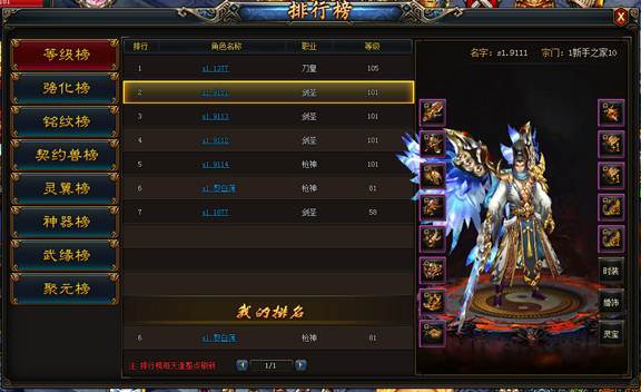 2.榜单分为等级榜、强化榜、铭纹榜、契约兽榜、灵翼榜、神器榜、武颜榜、聚元榜共8个榜。