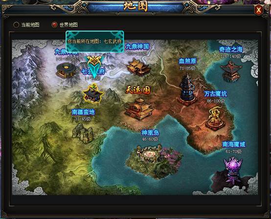 世界地图展示整个游戏世界中的地理位置,玩家可以点击任意一个小地图图标,打开小地图,走到具体的目标位置。