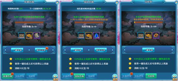 1. 日常任务(其中妖兽历练30min更新一次,有大概率随机爆出升阶丹哦~)的经验算是撑起了这款游戏的一片天(80%左右),日常任务是每日必做。而其中的组队历练在特定时间有双倍经验金币的奖励,百妖斩可以在电脑端挂机哦,当然也可以选择一键完成~组队副本系统贴心设计人满自动开启,60秒自动开打,如果忙不开可以选择勾选并且挂机;百妖斩是简单且奖励待遇和组队副本,妖兽历练一样的,只用挂机即可。特别注意,战力越高打的越快哦~(温馨提示:每日11:00-13:00和23:00-01:00银币和经验双倍收益~)