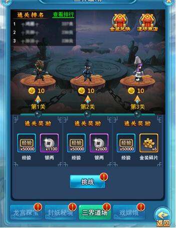 2. 三界道场(主城-副本)给的经验也是十分丰厚,自然难度也就比较高,过不去建议多打几次,这个游戏其实挺看暴击(脸)的。