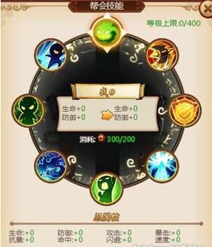 这个就是帮会技能的主界面了,我们能控制的就只有点击升级这个按钮。别的要不就是点X退出界面。我们点击升级的话就可以升级上面的技能获得属性加成,在总属性下面可以看见具体增加了多少属性。但是升级需要消耗帮会贡献。