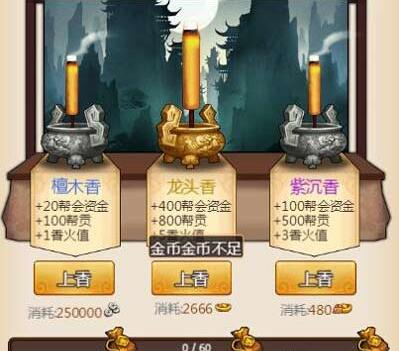 这个里就是帮会贡献获取最简单的地方了,不要任何操作。只要你上香就可以获得对应的帮贡去升级技能了。喜欢的话,或者说缺属性就赶紧去试试吧。
