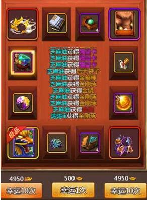 4950元宝幸运抽奖10次,500元宝幸运抽奖1次。