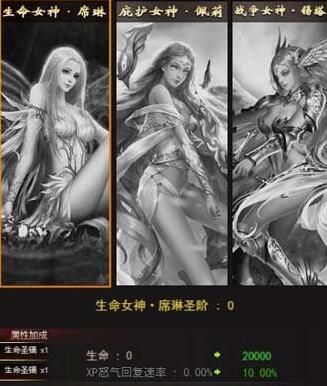 这个就是觉醒玩法的界面,这个生命女神一旦觉醒,就会获得生命,和怒气回复速度的加持。同样,庇护女神会增加物防和怒气技能持续时间,战争女神则是增加法防和对怪物的伤害。