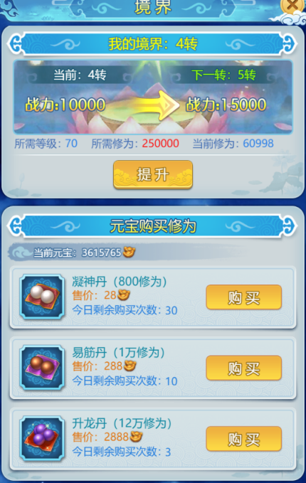 2.可使用元宝购买修为,或经验兑换修为,提升境界