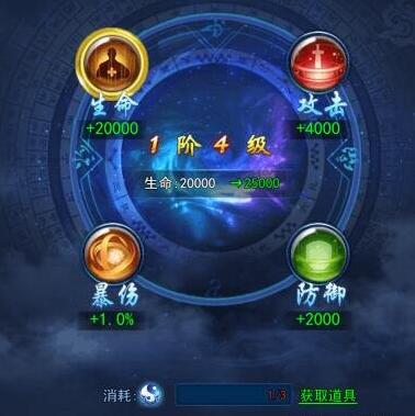 这个就是功法的界面了,生命、攻击、爆伤、防御四种属性在四个角落。增幅程度以数字显示在下面,清晰明了。而如果我们材料足够点击一键提升就可以获得属性上的提升了。