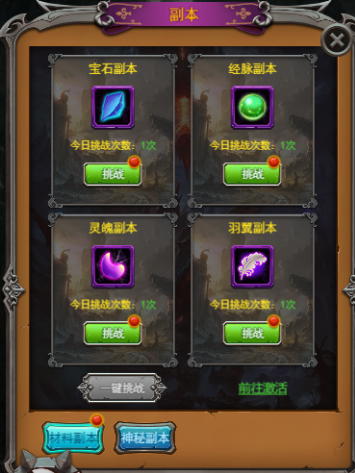 剧情主线完成了第一章后,角色等级大概到达10级,这时系统解锁材料副本和自动战斗两个模块,材料副本每天可以免费挑战一次和付钻石扫荡一次宝石、羽翼、灵魄、经脉4个副本,获得的材料可以在对应的人物、锻造模块升级提升属性。