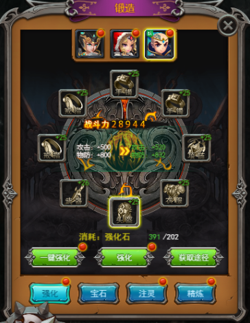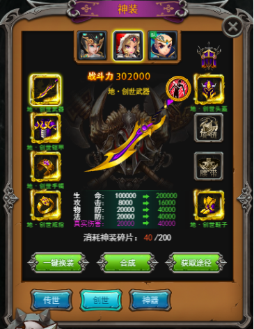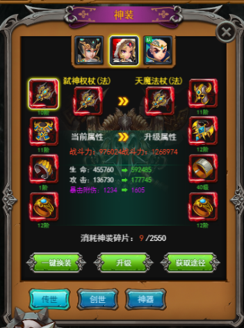 其中神装增加战力的数值扛扛的,而且效果最为明显,可以参加首冲、特权VIP、月卡等一波优惠活动,直接充送神装,战力瞬间提升一个档次。其中神装分为:创世、传世和神兵,除了各种活动送出之外,可以通过在神秘商店、VIP商店等地方购买。
