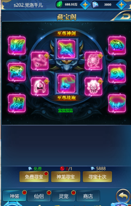 a)寻宝系统根据角色等级开启,分三类寻宝:神装、仙侣、神宠