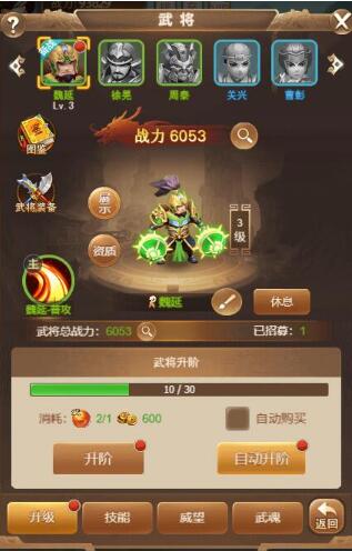 升级:消耗武将进阶丹和铜币提升武将等级,提升武将战斗力