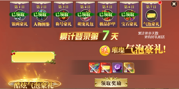 开服前七日,每天登陆游戏即可免费领取一份豪华大礼包!
