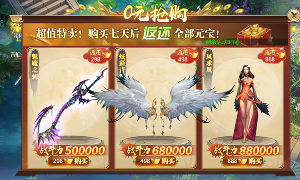 酷炫时装免费领,数百元宝免费送,绝版翅膀等你来拿,花多少还多少。