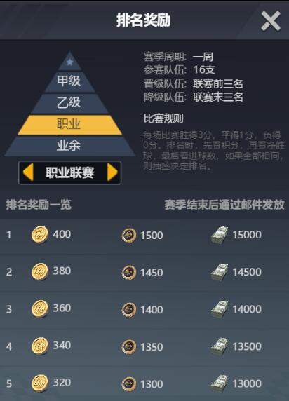 联赛共分为4个级别,从高到低依次为甲级,乙级,职业和业余,玩家俱乐部达到10级解锁联赛后默认进入业余联赛。