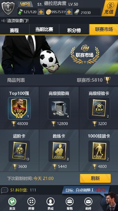 每日和赛季末送的联赛币可以在联赛市场兑换想要的道具,联赛市场里能刷到顶级球员Top100强,教练卡等高级道具,记得经常来逛逛哦。