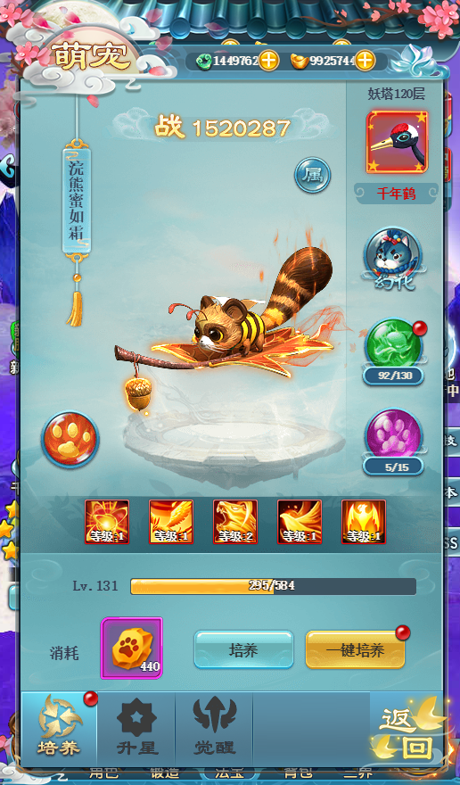 升星,单个萌宠可以通过消耗相同的萌宠进行升星,不仅能提升属性还能提高神炼丹、资质丹的吞噬上限。