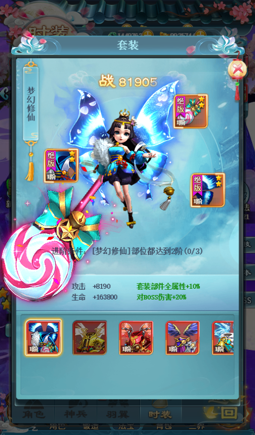 当仙友凑齐同一系列的时装,神兵,羽翼时,可激活套装效果,获得永久战斗属性和专属套装属性,当仙友套装内的皮肤都达到一定阶数时,可对套装进行升阶,并永久提升属性