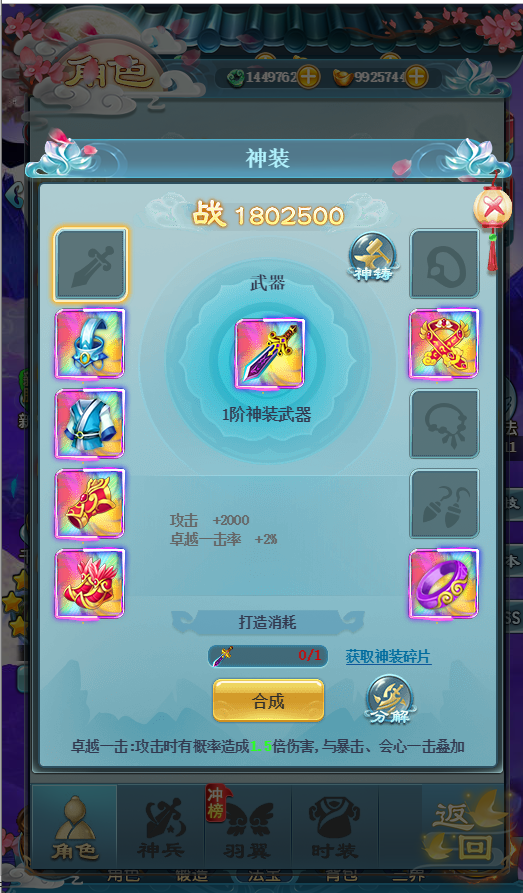 分解,可对多余的神装进行分解,分解后获得神装碎片