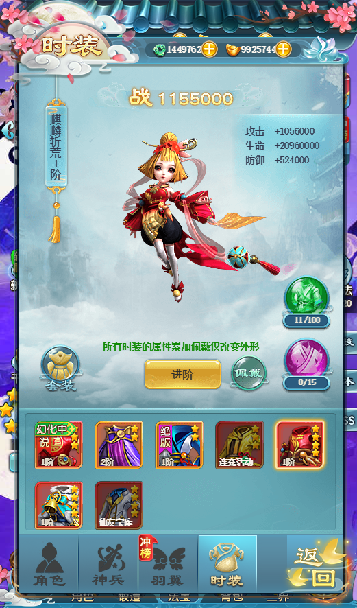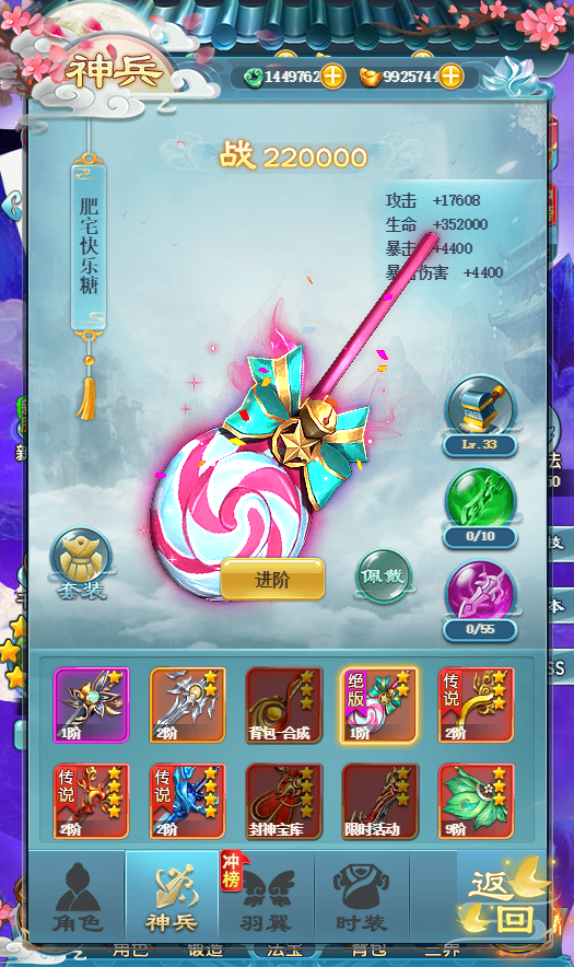 进阶,获得相同的皮肤可对对应的神兵进行升阶,提高神兵属性,同时提高神炼丹和资质丹的吞噬上限