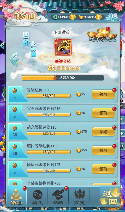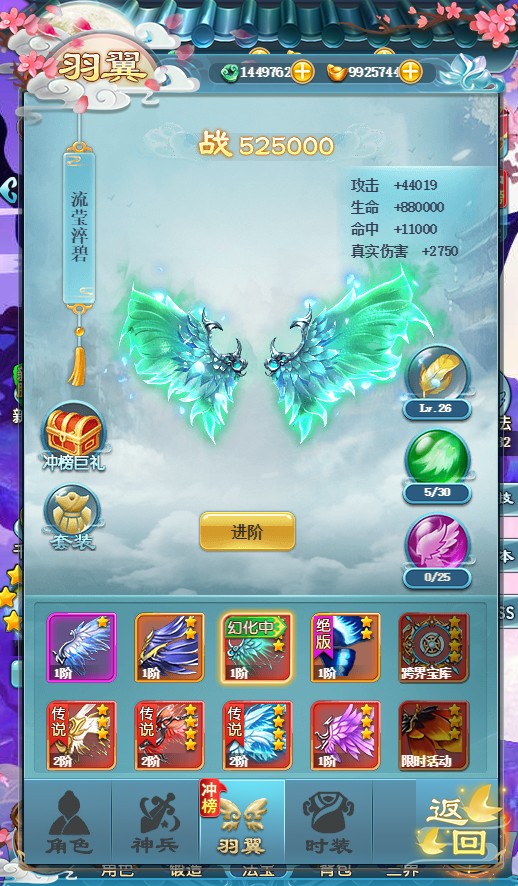 淬炼/注灵(神兵/羽翼),通过消耗神兵陨铁对神兵进行升级,提升神兵属性