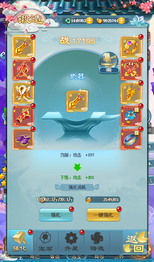 强化:消耗强化石和铜币强化装备部位,提升装备属性——攻击和生命