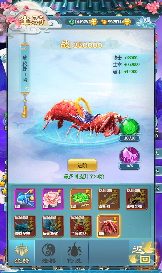 佩戴,仙友可以通过激活不同的坐骑皮肤,选择喜欢的坐骑跟随自己驰骋天下