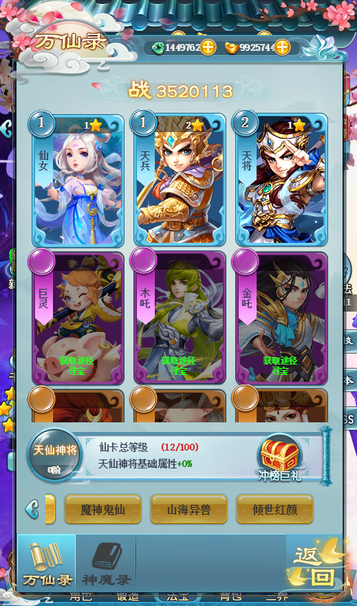 万仙录分为天仙神将、魔神鬼仙、山海异兽、倾世红颜等四种不同类型的卡片,在收集不同的卡片的同时获得人物属性加成