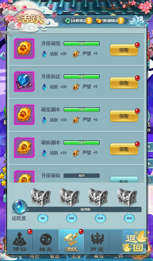 日常系统将会给各位仙友提供每日目标指导哦,完成对应目标还可以获得对应的奖励。是在漫漫修仙路上的好助手。每完成一个目标,将会获得一定活跃度和奖励,活跃度达到目标值还可以领取活动度奖励呢~