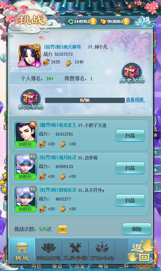 作为一款炫酷的修仙游戏,怎么少得了与其他仙友比较一下孰强孰弱呢!点击界面右方的竞技按钮,可以打开查看挑战游戏中的各种竞技类活动,挑战、群仙论道、三界争霸、万仙斗法等你来战!