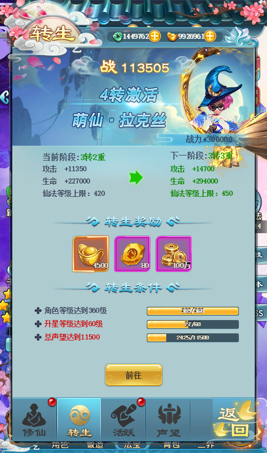 仙友达到一定的条件还能进行转生,点击下方转生切页即可查看当前转生等级,转生属性,转生条件,转生奖励~,每达成一次大转生即可获得新的萌仙青睐呢~