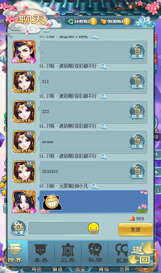 作为一款精致的修仙游戏,聊天是必不可少的。供各位仙友的修仙聊天室就在主界面下方的聊天栏,点击即可与各方仙友进行联络了哦!《少年封神》中的不仅可以与伴侣私聊,查看系统信息,还可以跨界聊天的呢!不仅如此,还能发表情,收取红包!呐,仙友还不去用言语勾搭一个小姐姐小哥哥么?