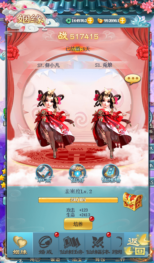 一个人修仙太寂寞?不要担心,《少年封神》为诸位仙友提供了姻缘系统,在这里你可以在仙缘墙上征婚,求婚!记得求婚的时候带上婚戒哦,拥有伴侣后就可以开始双修共赴仙路之旅啦~,婚后还能对婚戒进行养成提高双方仙侣的属性呢~,更可以带上你的双修伴侣参加有趣的姻缘活动呢!