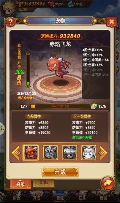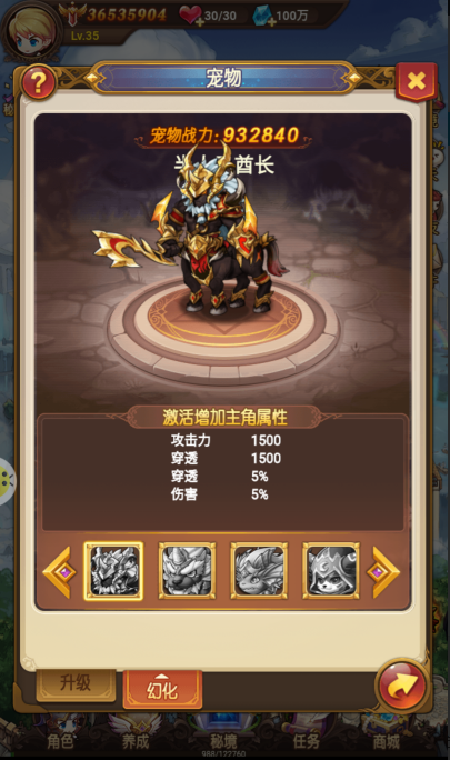 目前宠物的养成模式分为升级和幻化两种,升级可以激活对应的阶数天赋值,就是刚才说的百分比的属性加成,同时等级的提升还可以增加固定属性。幻化之后会提供大量的伤害属性加成,攻击、穿透、伤害等。