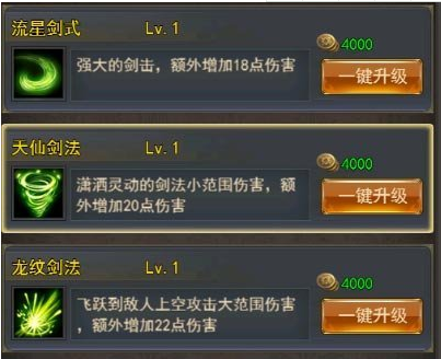 龙纹剑法:飞跃到敌人上空攻击大范围伤害,额外增加22点伤害。