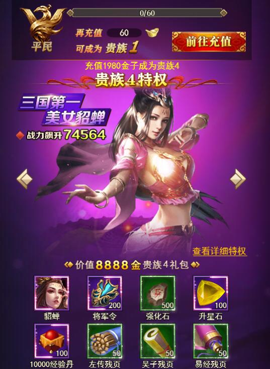 御天传奇想获得貂蝉要充多少钱?作为御天传奇里的三国第一美女,貂蝉的鼎鼎大名各位无人不知,有玩家想知道,如何获得貂蝉,要充多少钱呢?