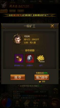 挖矿总共需要30分钟,但勇士无需留在矿洞当中,回到主城或挑战副本矿工也会继续挖矿!开始挖矿后,勇士还可以点击其他勇士雇佣的矿工进行掠夺。如果你的战力比敌方勇士高,大胆掠夺他的矿物吧!每天有5次掠夺机会,千万不要浪费!