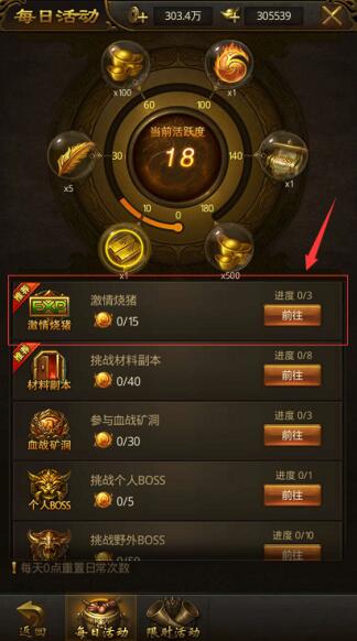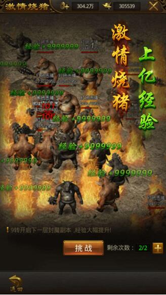每天可以免费进入激情烧猪两次,每次均能获得上亿经验!两次不够过瘾?使用元宝还能再增加进入次数!