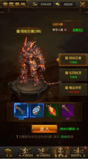 雷霆禁地里的BOSS十分强大,因此,只有3转以上的勇士才能进入哦!三个BOSS由于实力不同,准入门槛也有所区别,分别为3转、5转、7转。不过,风险越大,回报越大。越高级的BOSS,所产出的雷霆装备星数也越高!