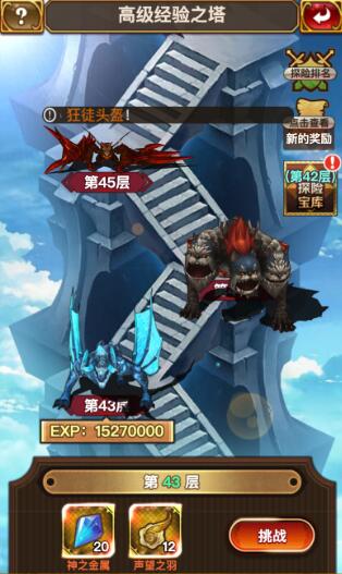 除了打败守塔魔物获得奖励,玩家还可以通过经验塔的宝库进行寻宝,获得大量的经验药水以及经验徽章,而且玩家达到的层数越高,宝库中的奖励就越丰厚。