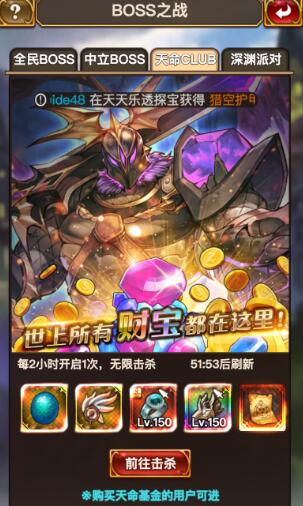 3、 天命club:进入天命club,击杀boss,有大量机会获得传承装备。要注意,天命club只有购买过天命基金的玩家才能够进去哦。